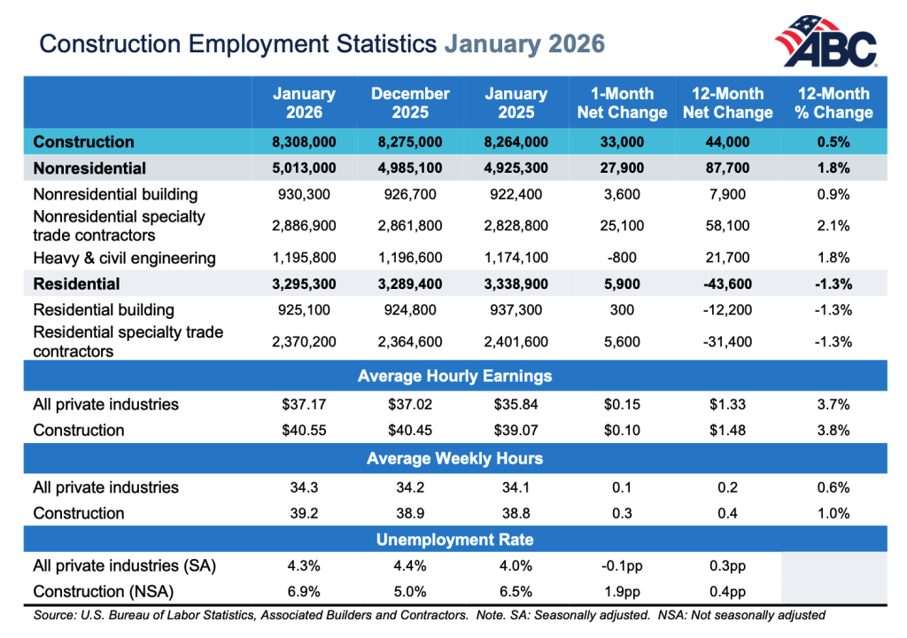 WASHINGTON, Feb. 11—The construction industry added 33,000 jobs on net in January, according to an Associated Builders and Contractors analysis of data released by the U.S. Bureau of Labor Statistics. On a year-over-year basis, industry employment has grown by 44,000 jobs, an increase of 0.5%.