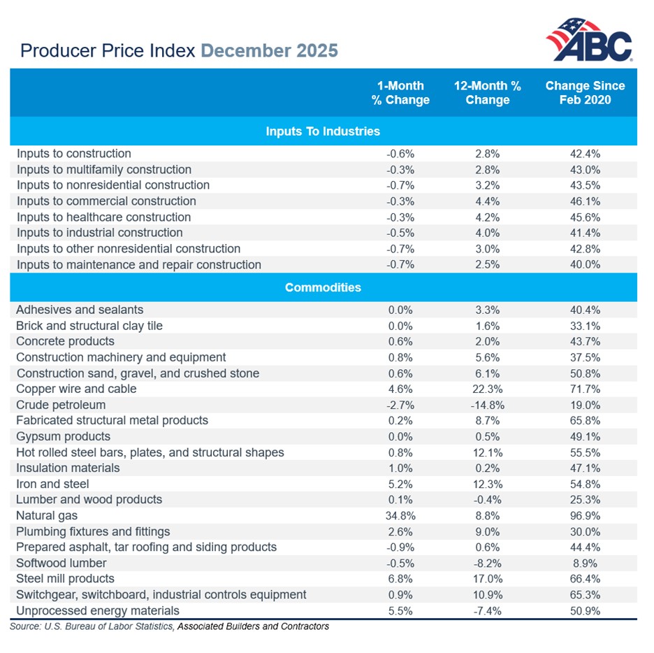 “Construction materials prices posted a welcome decline in December, yet key inputs are still experiencing rapid escalation,” said ABC Chief Economist Anirban Basu. “This is especially true for materials most exposed to tariffs. Copper wire and cable prices, for instance, jumped an incredible 4.6% in December and are up more than 22% year over year, and prices for primary nonferrous metals are up nearly 62% over the past 12 months.