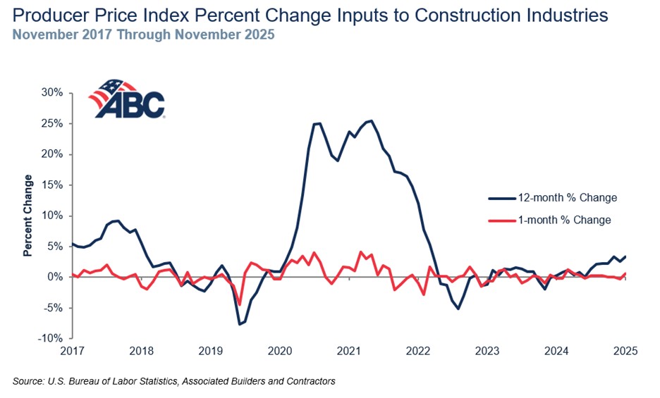 “Construction input prices surged in November and are now up 3.4% on a year-over-year basis,” said ABC Chief Economist Anirban Basu. “While that’s a relatively modest annual increase, it’s also the largest since January 2023 and the trend offers plenty of cause for concern. Many tariff-affected materials, like derivative metal products and switchgear equipment, have experienced considerable price escalation in 2025. Prices for aluminum mill shapes and primary and secondary nonferrous metals are both up more than 25% over the past year.